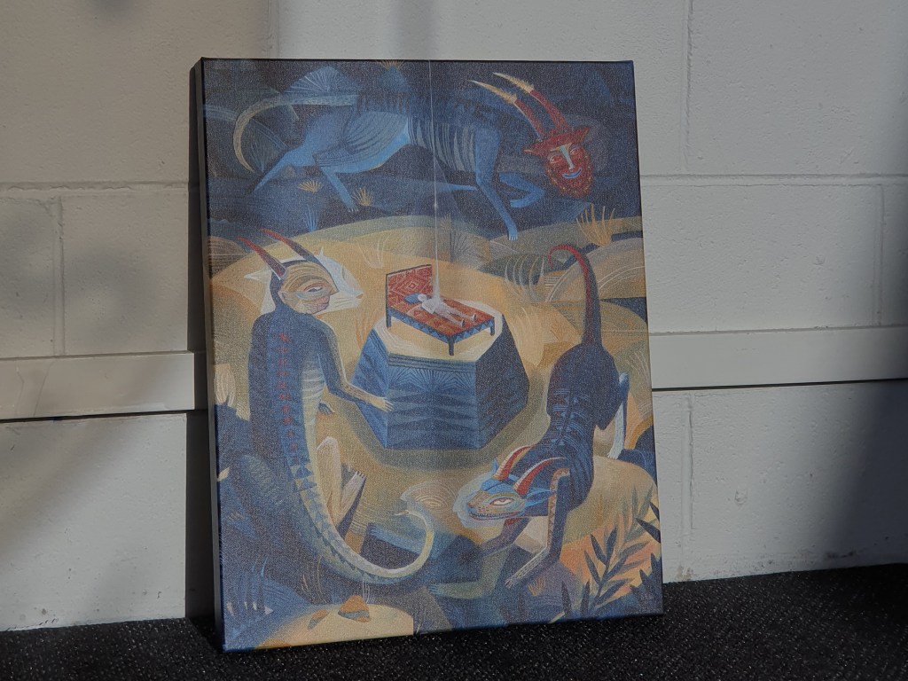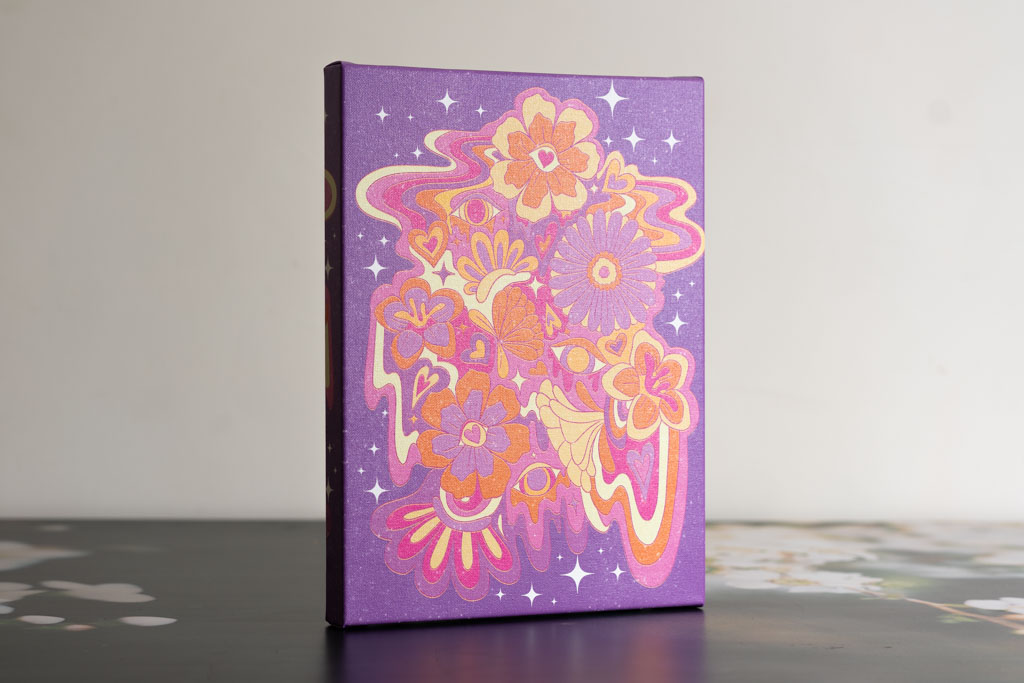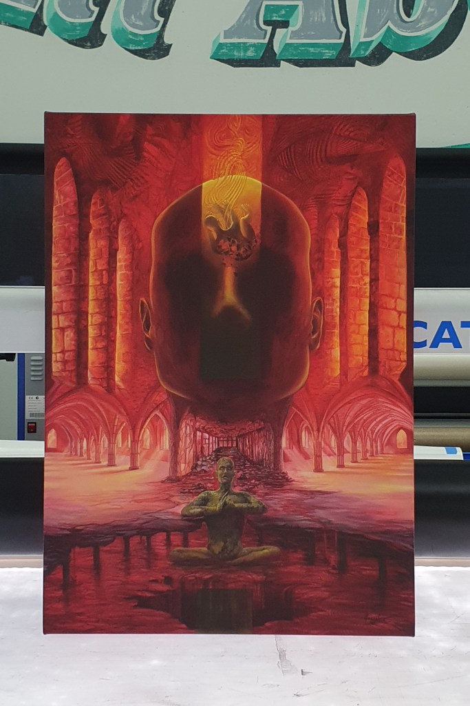 The artwork is printed onto our 318gsm Premium Satin Canvas stock, using a CMYK printing process with Eco-Latex ink, and a liquid laminate overcoat to protect the final product.